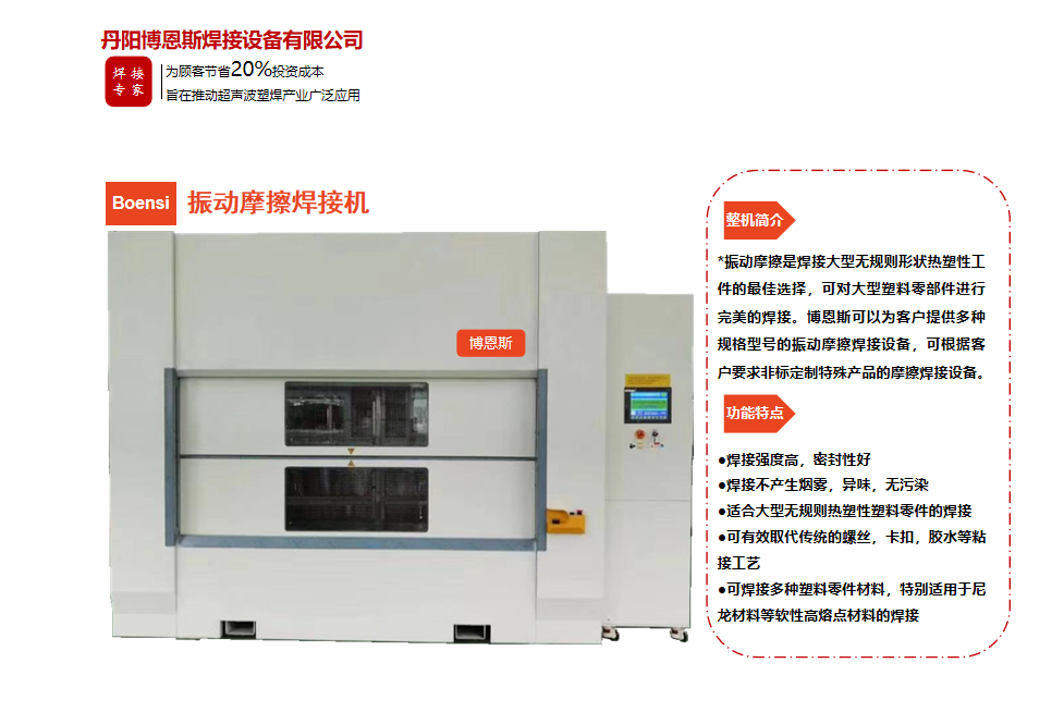 丹陽博恩斯焊接設備有限公司是塑料焊接領域集研發(fā)設計、生產制造、銷售服務為一體的企業(yè)。公司自成立以來堅持“以人為本”的理念,組織了一支強大的技術研發(fā)團隊,攜多年來積累的豐富經驗,并結合國際先進塑料焊接技術,根據(jù)市場需要,不斷開發(fā)具有核心競爭力的新產品。公司具有很強的非標機械研發(fā)、設計、生產能力,可為廣大客戶定制各類專用機械設備。公司設計生產的塑料焊接設備已廣泛應用于汽車、電子、家電、醫(yī)療器械、無紡布...